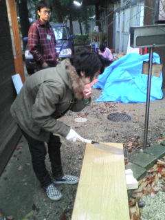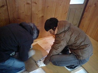 ②むすびの家の近くにある小屋の床張り作業